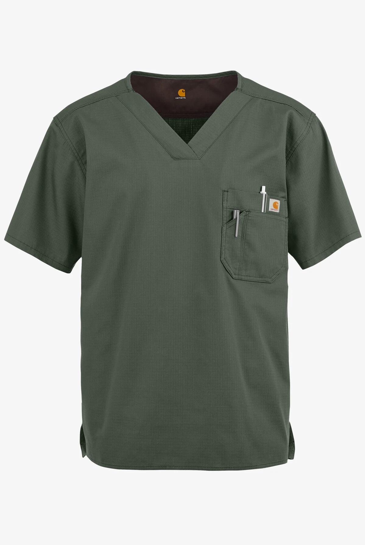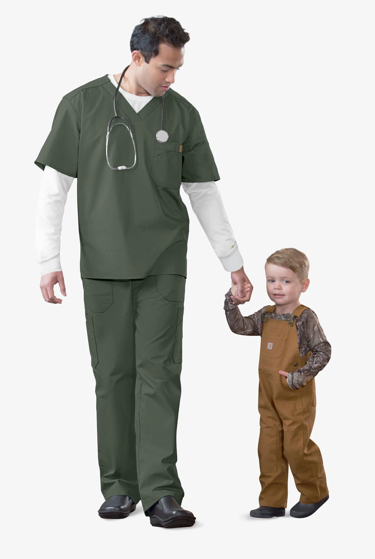 Carhartt Men’s C15108 Ripstop Utility Scrub Top combines great worksmanship with incredible comfort. Back is 1 1/2” longer than front for added coverage. Durability at its finest. Carhartt Ripstop men’s scrub collection combines cotton-rich ripstop fabric with reinforced, interwoven threadwork for tear-resistant pieces that last.