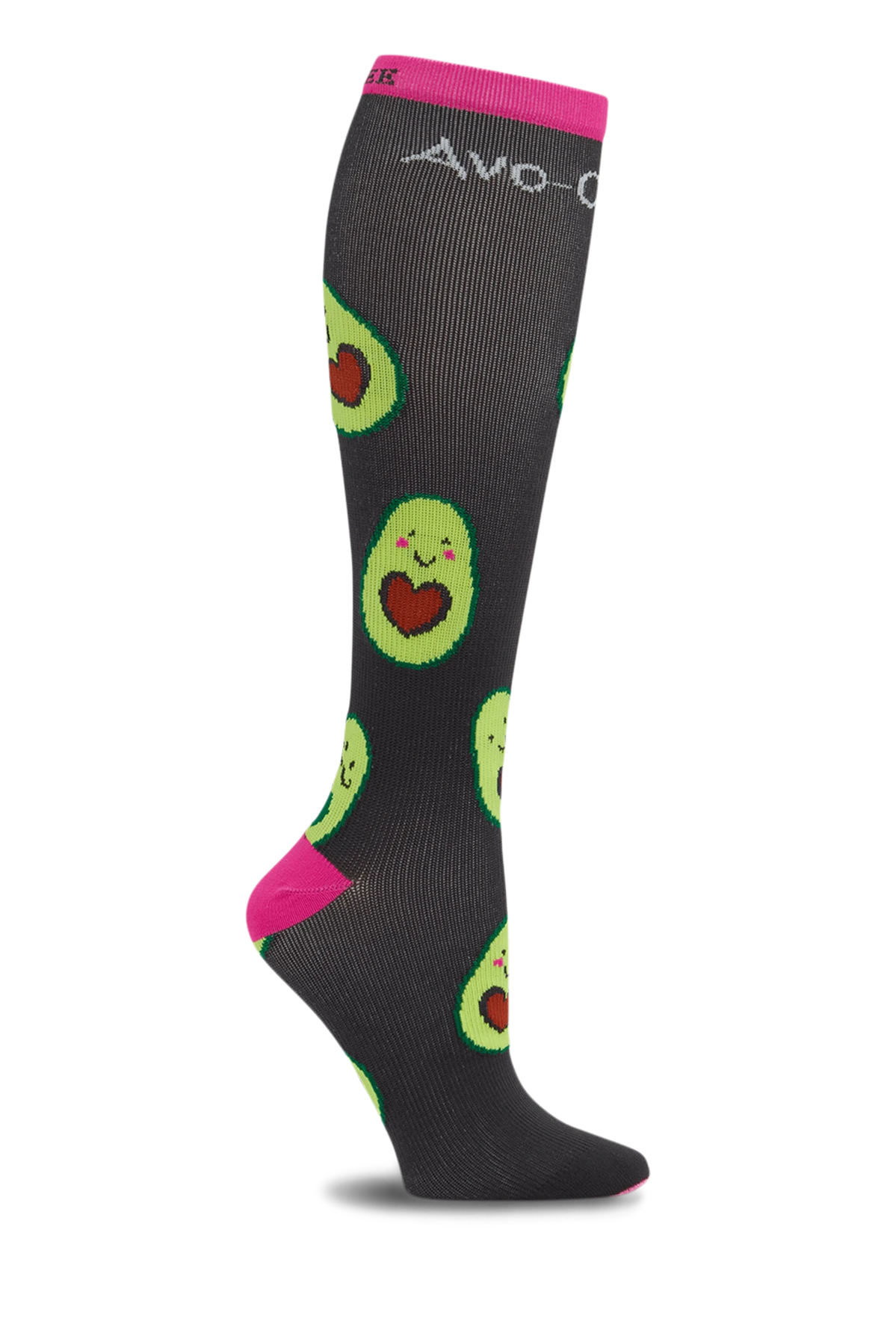 Legs tired at the end of your shift? The light, gradient compression of Cherokee Avo Cuddle Print Support Socks may help prevent fatigue and soreness. Compression is greatest at the ankle, lessens gradually to the non-binding top band. Plus avocados with faces. How cute is that? One size fits most.