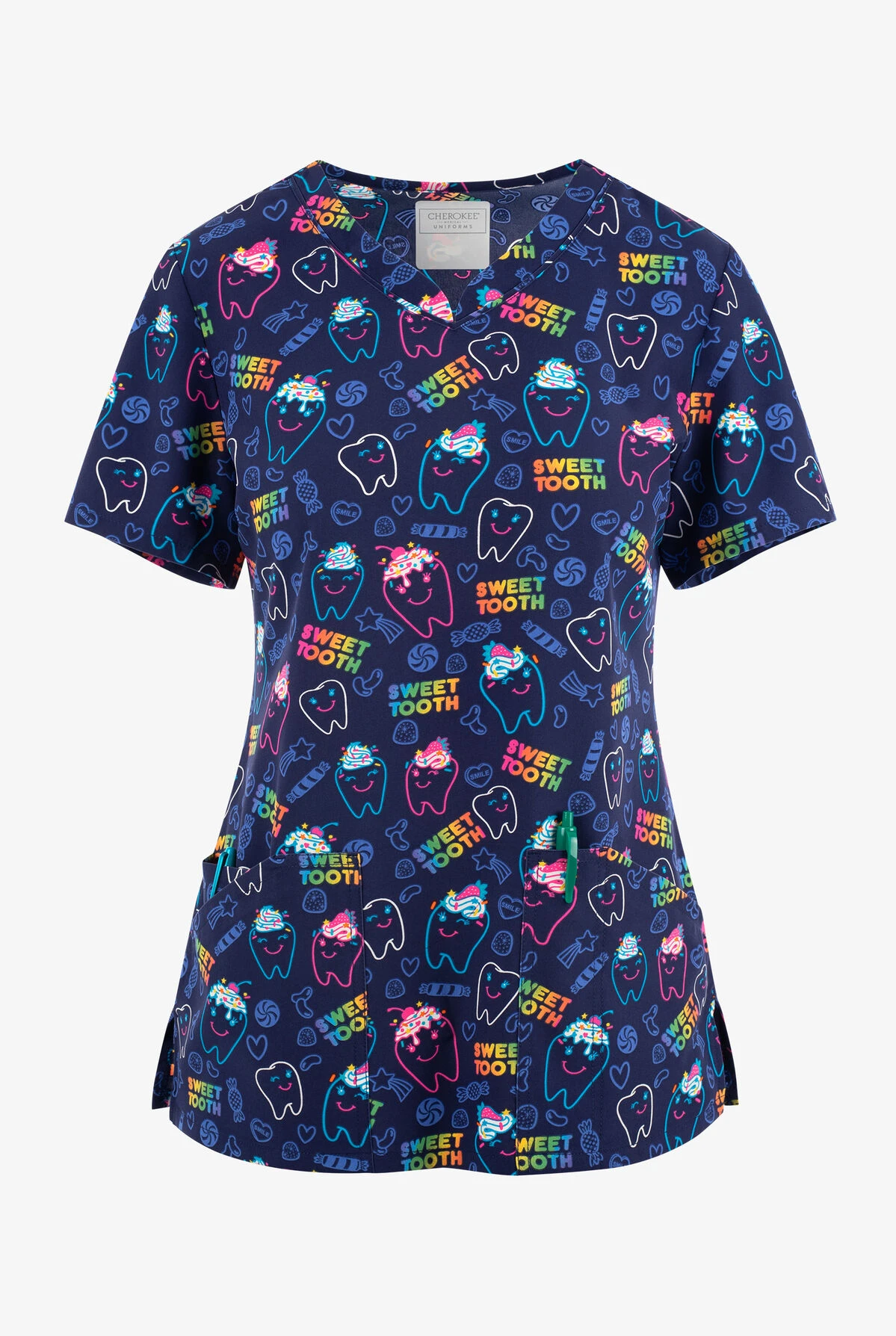 - Colorful teeth, “Sweet Tooth”, and candies on a navy background