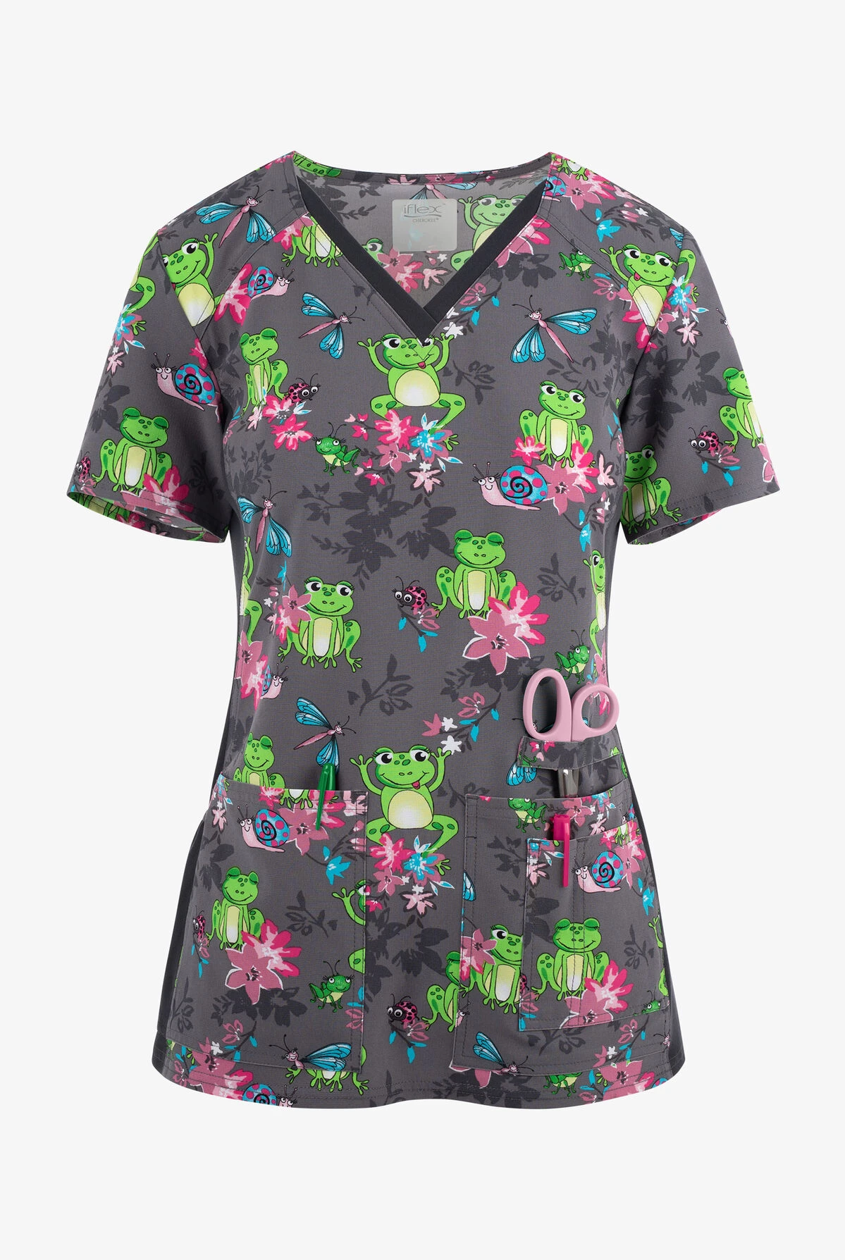 - Whimsical frogs, snails, dragonflies, and lady bugs on a floral pewter background