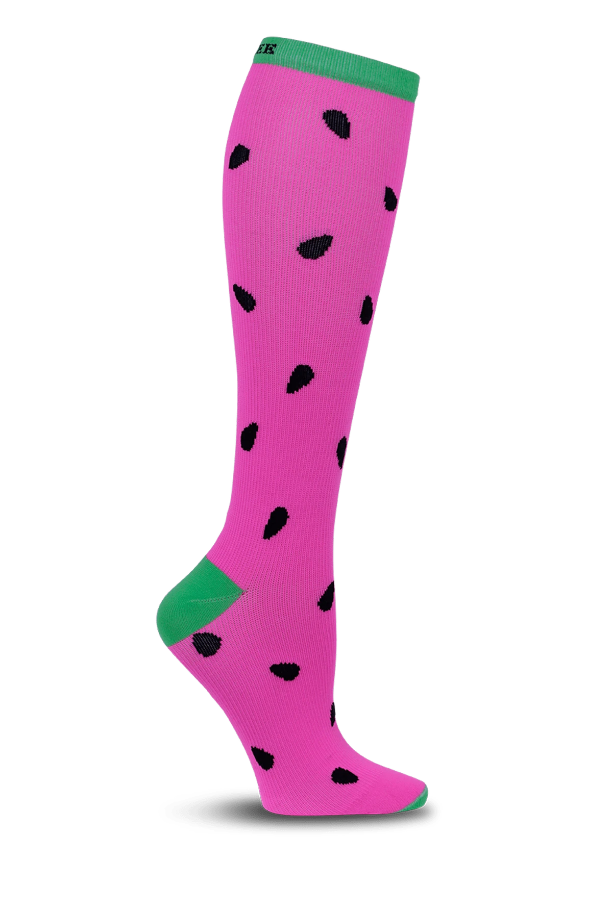 Legs tired at the end of your shift? The light, gradient compression of Cherokee Print Sweet Watermelon Support Socks may help prevent fatigue and soreness. Compression is greatest at the ankle, lessens gradually to the non-binding top band. A perky print lifts your mood too. One size fits most.