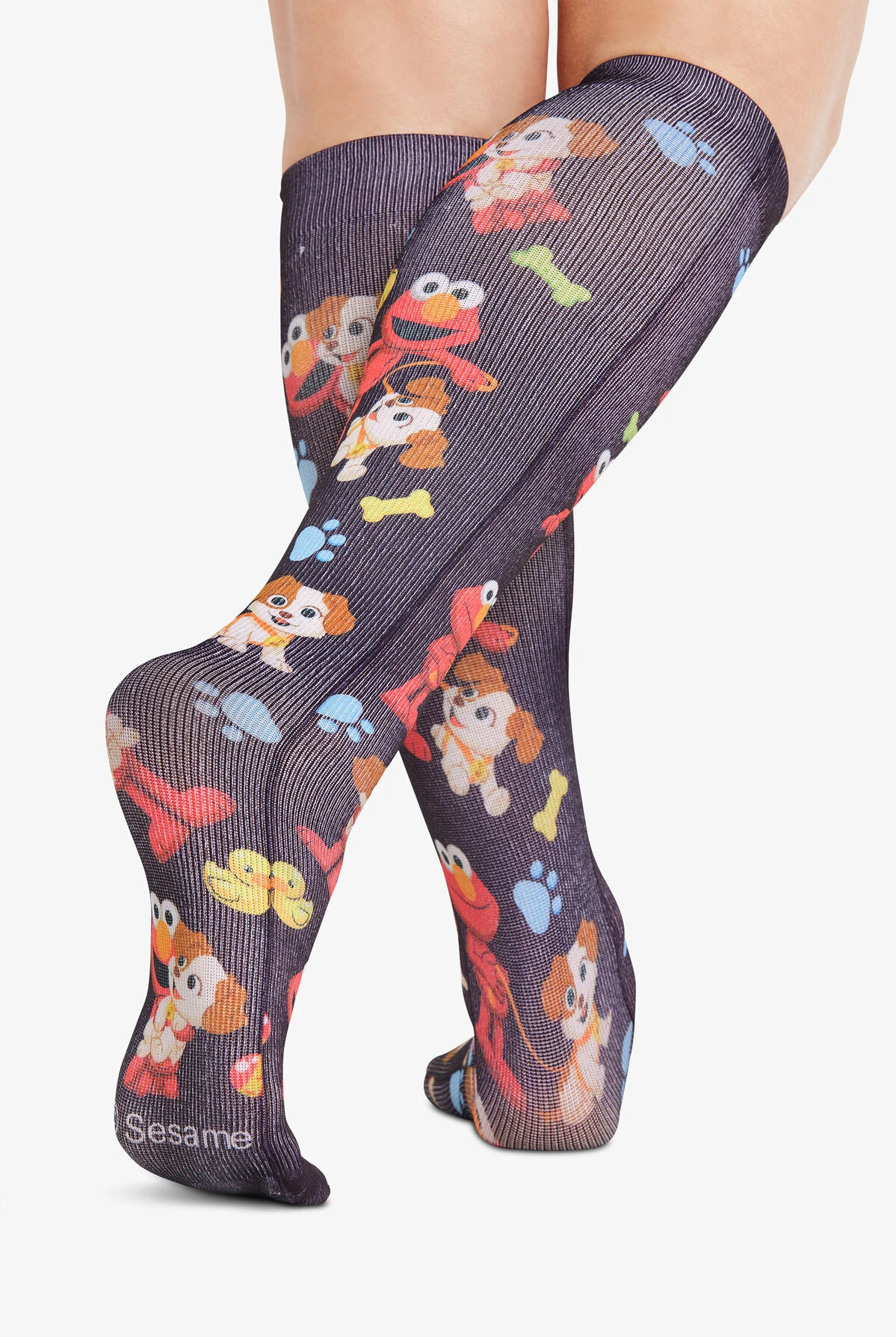 - From Sesame Street Elmo and his puppy Tango on a black background dotted with bones, balls, paw prints, sticks, and rubber duckies