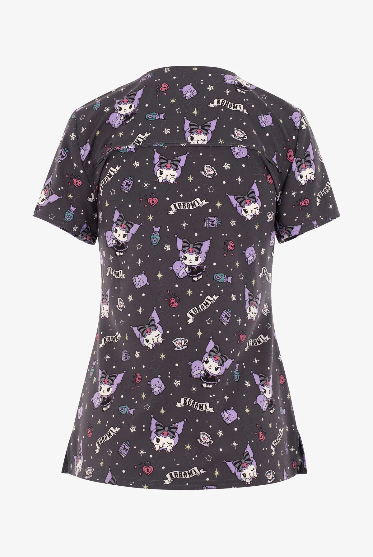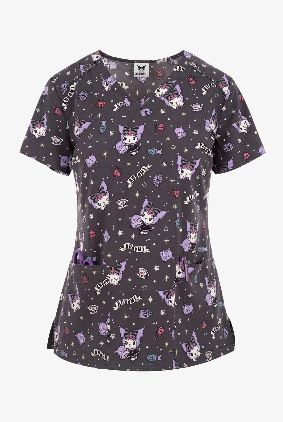 - Sanrio’s Kuromi is popping up all over in this fun goth inspired print on a pewter background strewn with heart locks, stars, perfume bottles and tea cups.