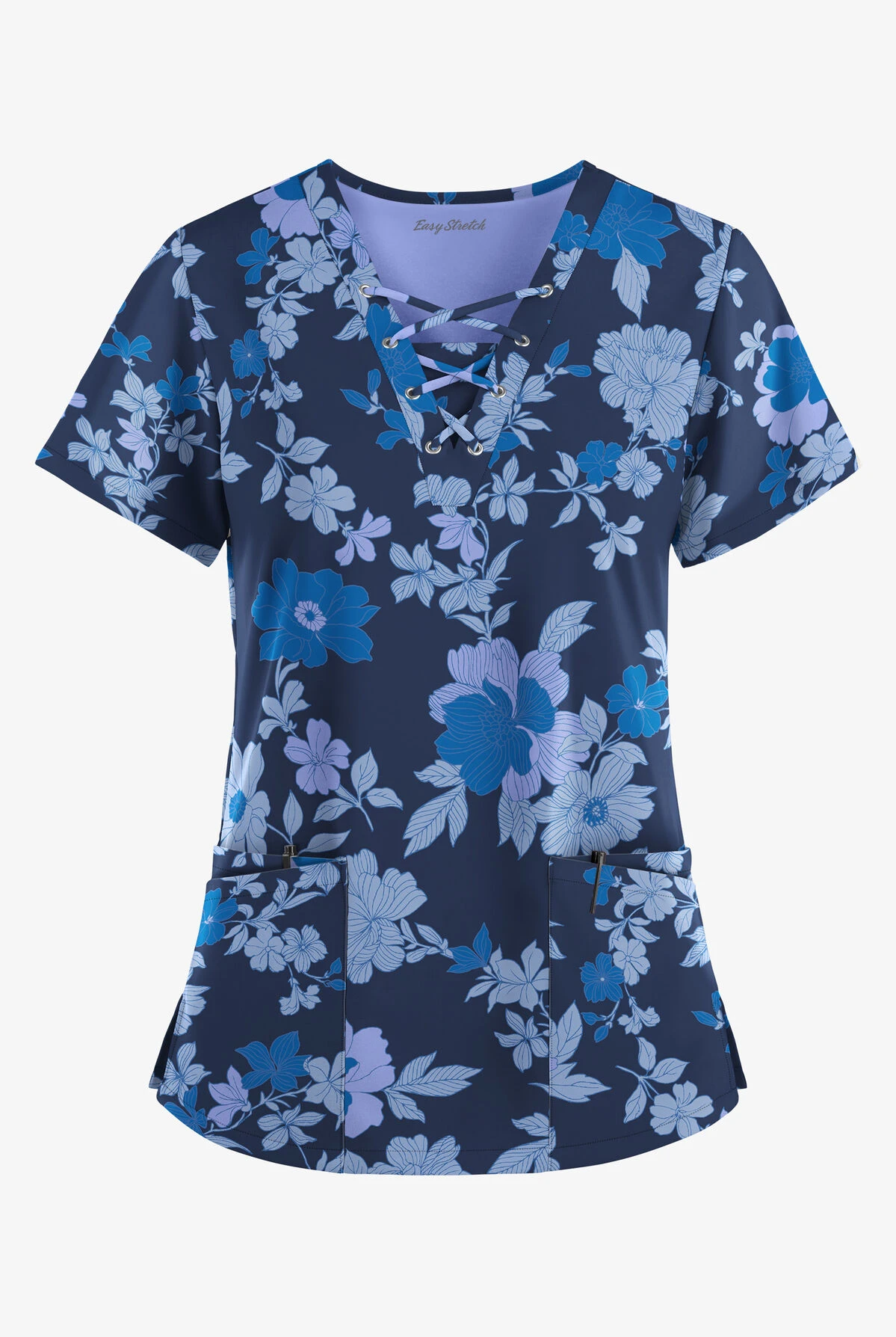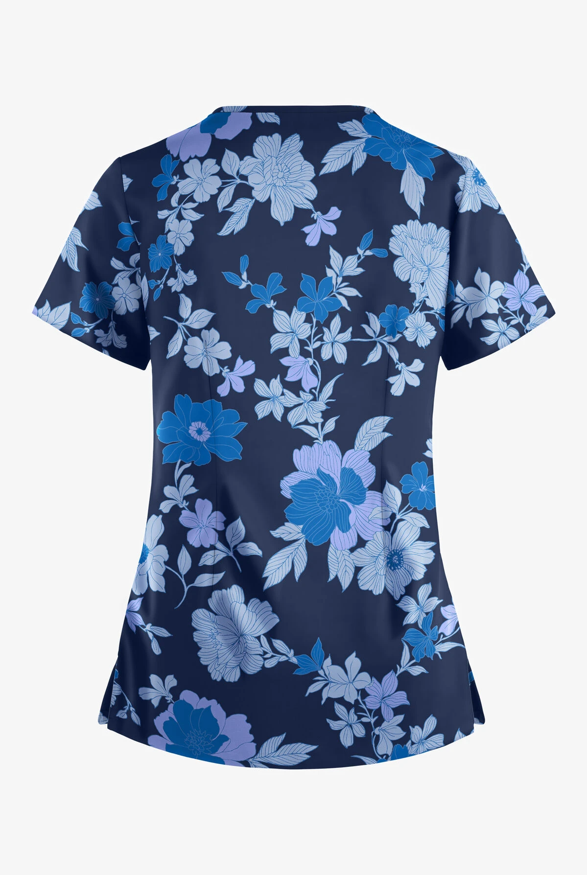 The Easy Stretch by Butter-Soft Gisele paris floral navy women’s 5-pocket v-neck print scrub top has a lace up deep v-neckline with a small modesty inset. There is tailoring through the chest, back darts, and side vents, for an overall slimming and on-trend look. For all of your storage needs, there are 5 pockets 4 patch pockets and a cell pocket. Fabric content is 93/7 poly/spandex.