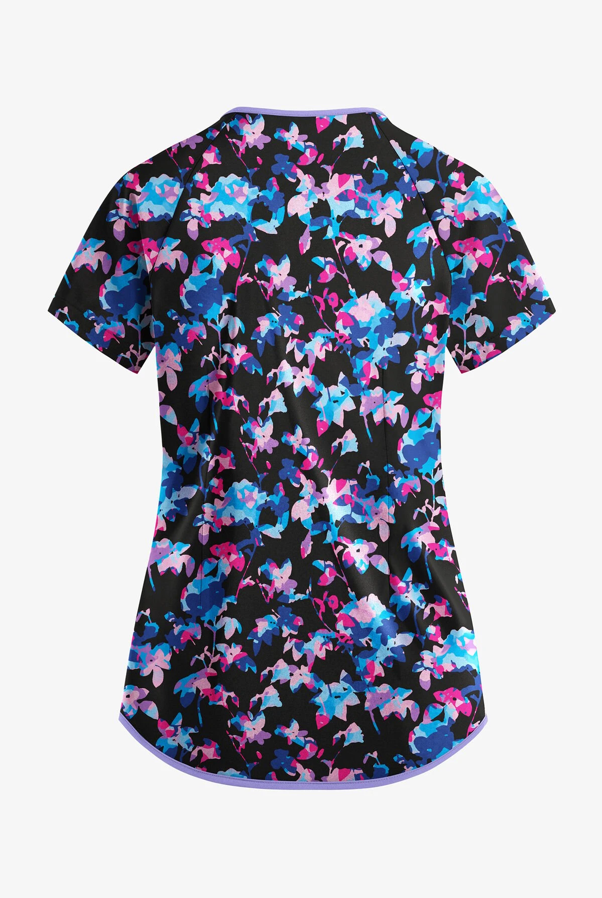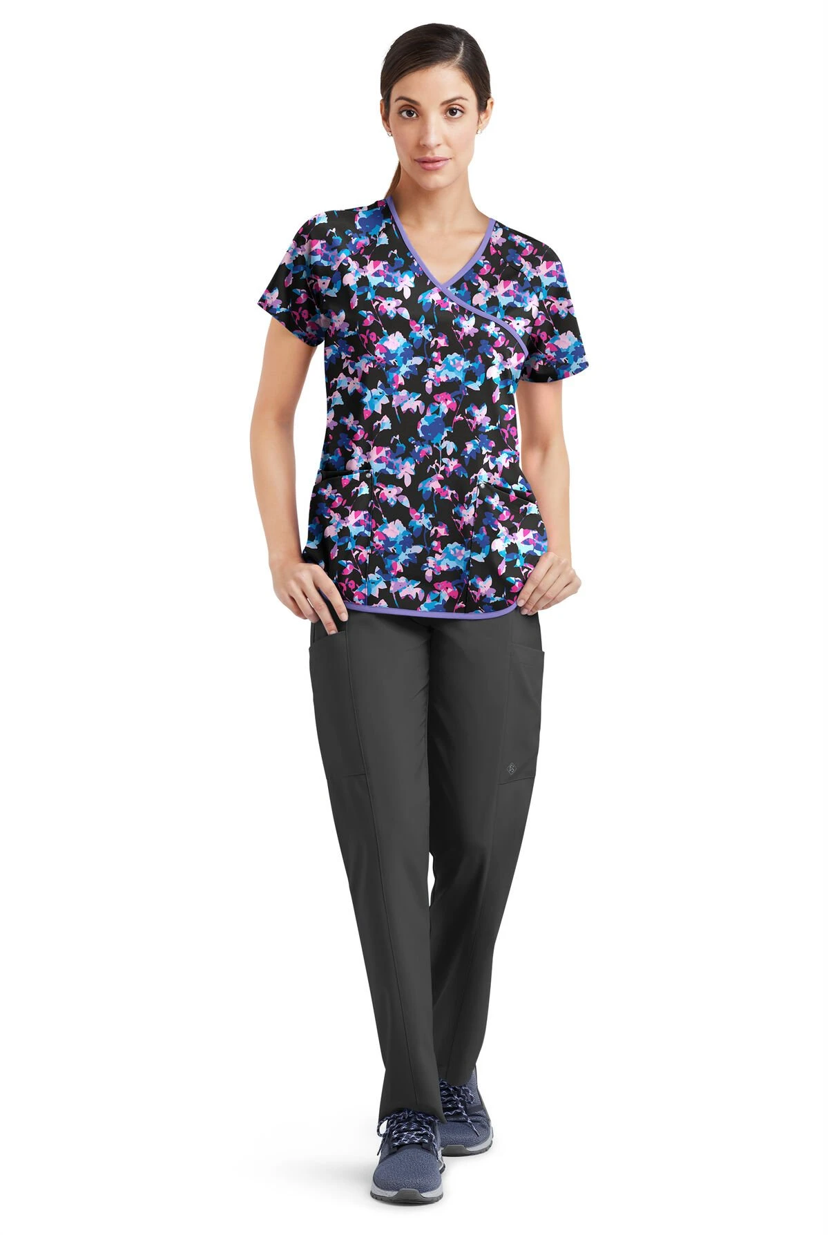 Raglan sleeves and a crossover v-neckline give a traditional scrub top a subtle update.