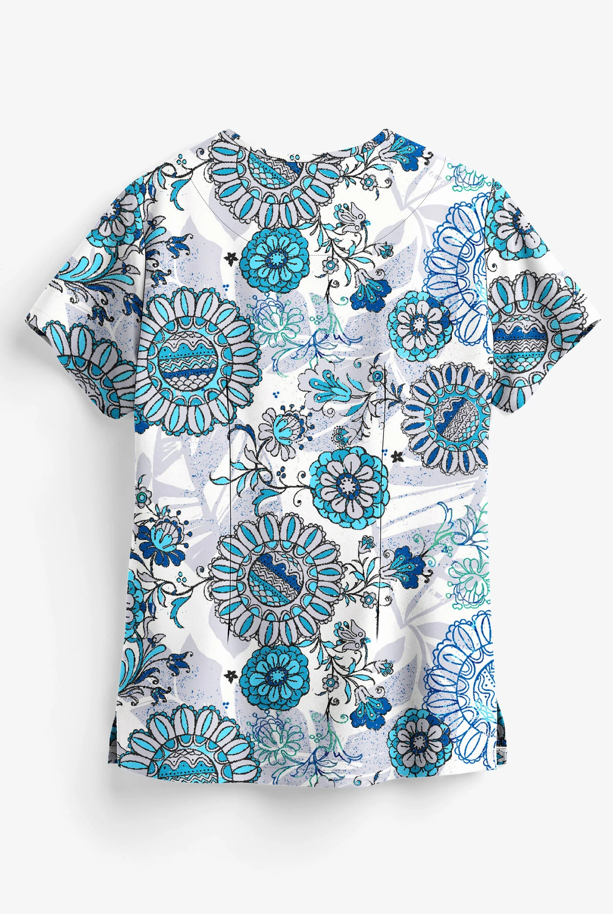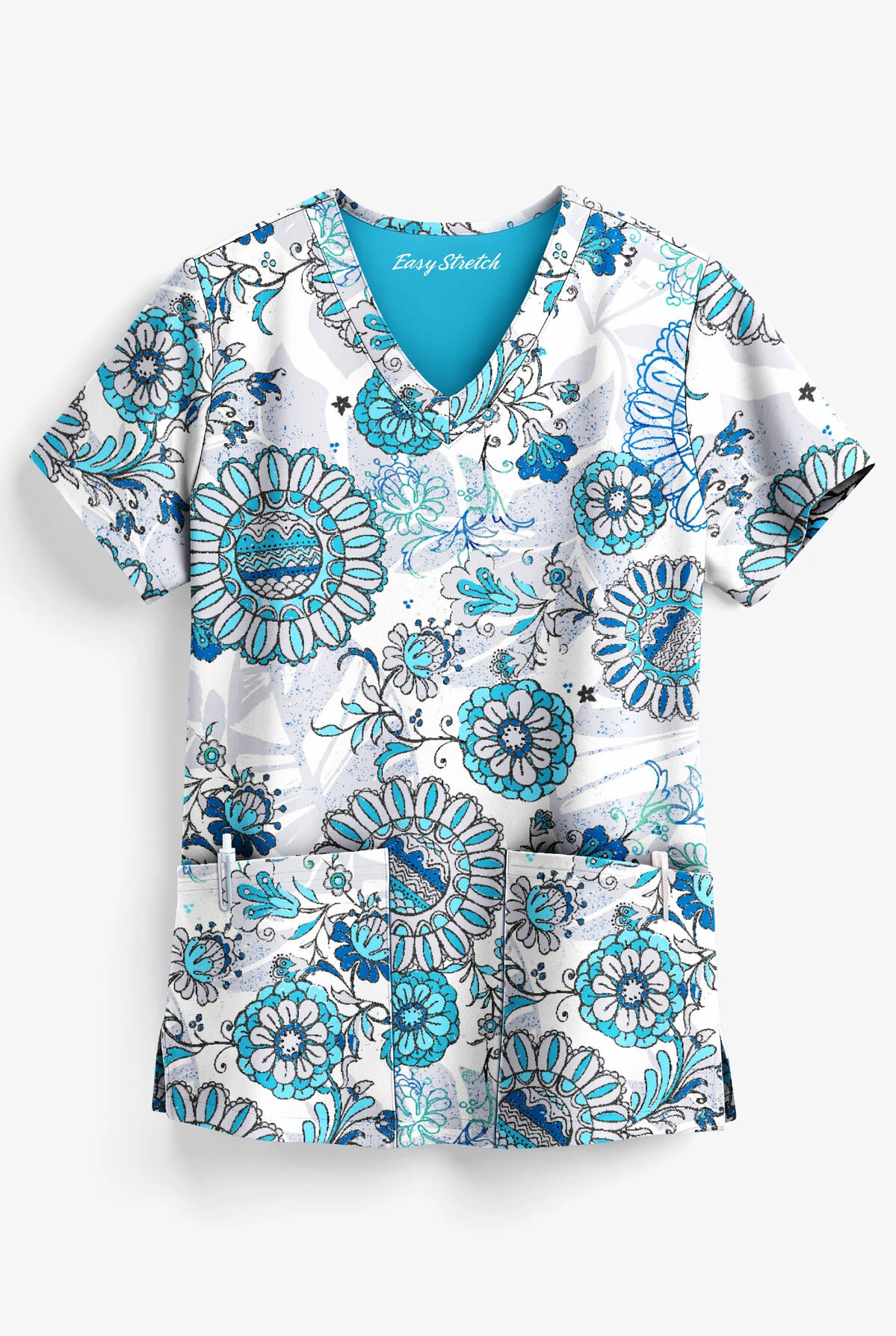 The Easy Stretch by Butter-Soft neon floral silver print scrub top is a great choice for any nursing wardrobe! This top has a classic fit with flattering ‘v’ neckline style. For storage it has two roomy front pockets and side vents for greater range of motion. It has back darts on garment for flattering fit. Fabric content is 93/7 poly/spandex. The approximate length for size m is 27.5″.