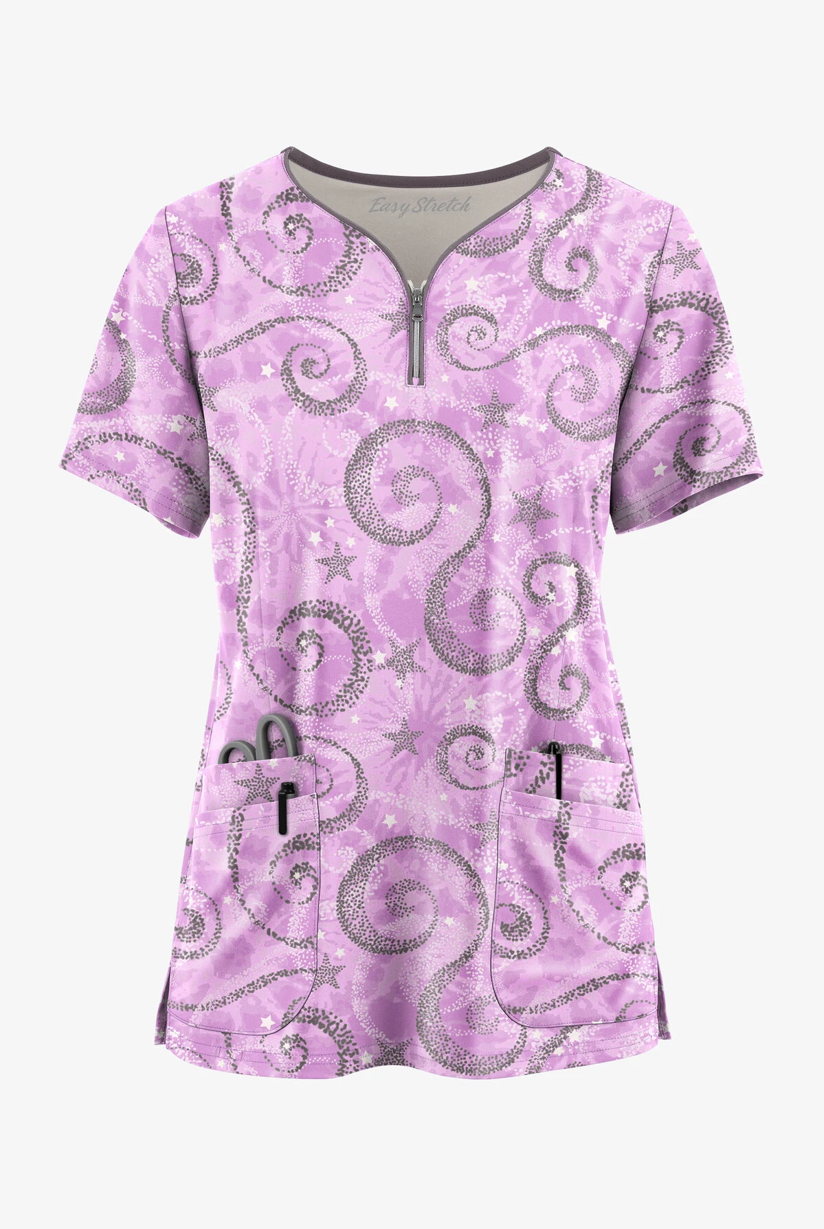 Versatility! You love it and so do we. A shiny nickel zipper at the curvy v neckline of this cute top gives you styling options. Darts front and back give it great shape. And pockets! As mysterious as the night sky – stars and nebulae plus a touch of fun.