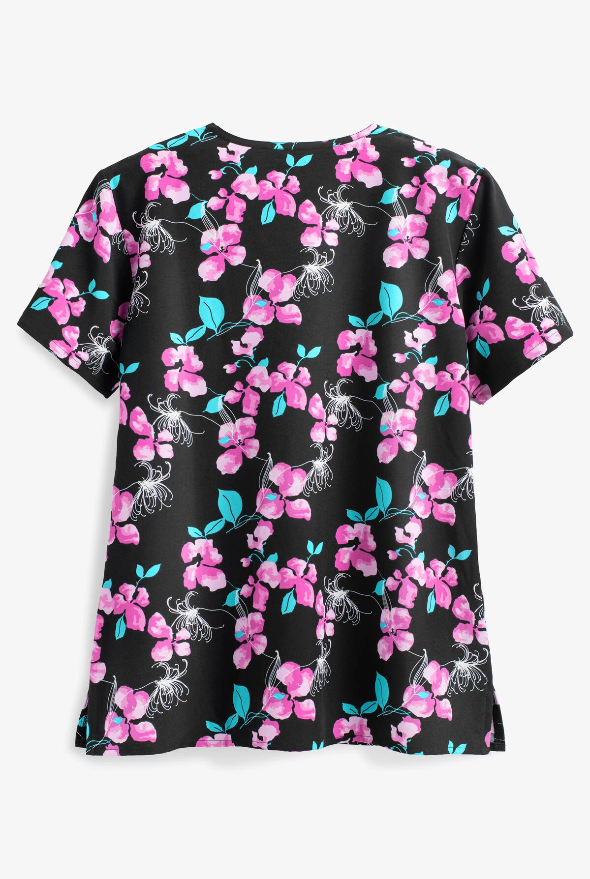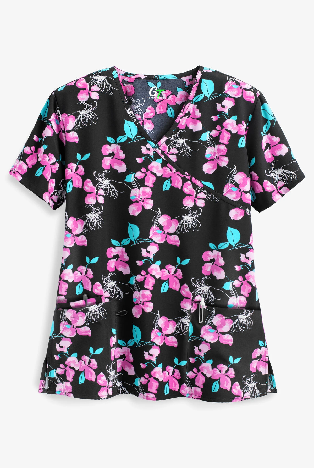 The Green Town UA-507-614 Abstract Honey Suckle Mock Wrap Scrub Top features self trim on neck and mock line, 2 front patch pockets with 1 inner slip pocket and bungee loop on right and side slits. Fabric content is 93/7 poly/spandex.