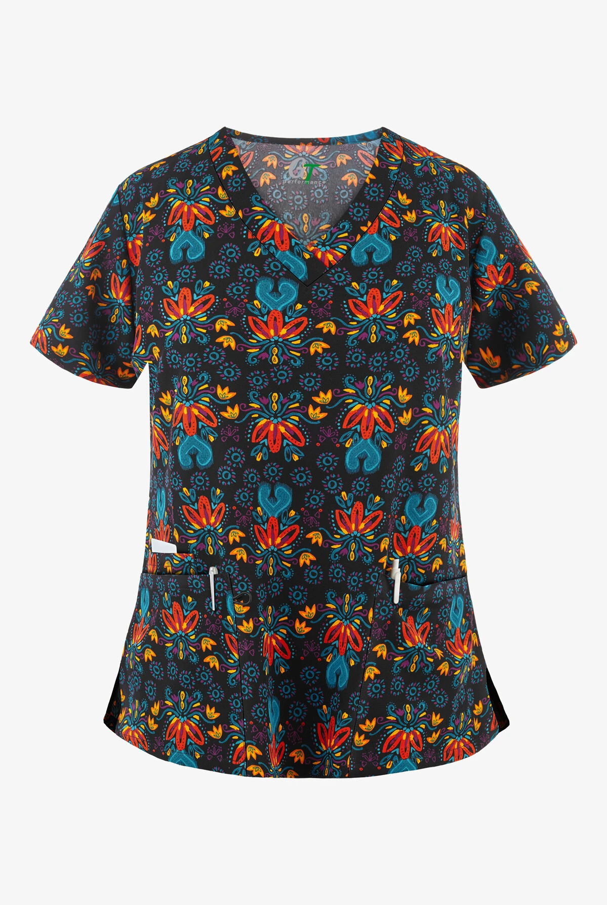 The Green Town UA-501-1418B Ethnic Floral V-Neck Print Scrub Top features a self fabric banded v-neckline, side slits and 3 pockets; 2 front patch pockets and 1 inner slip pocket and bungee loop on right. Approximate length of Medium is 27″. Fabric content is 93/7 poly/spandex.