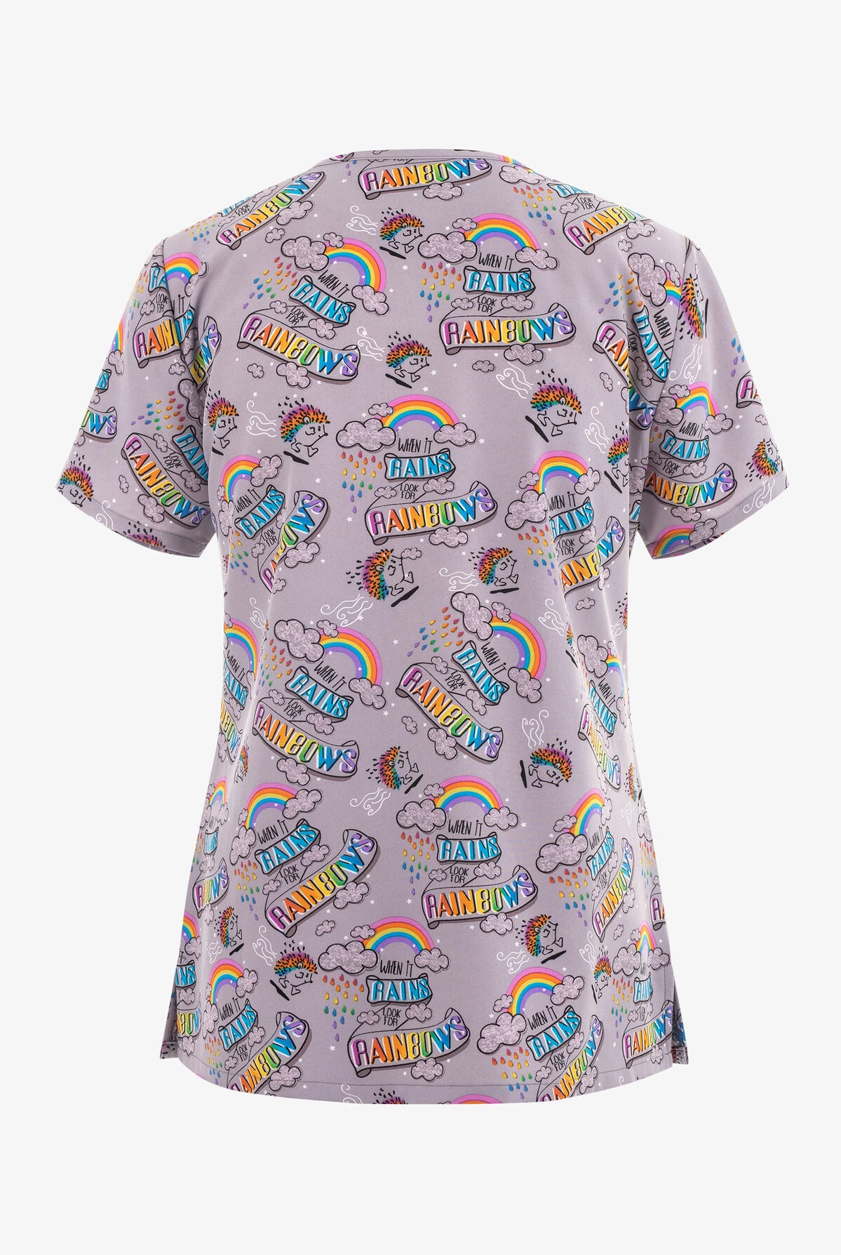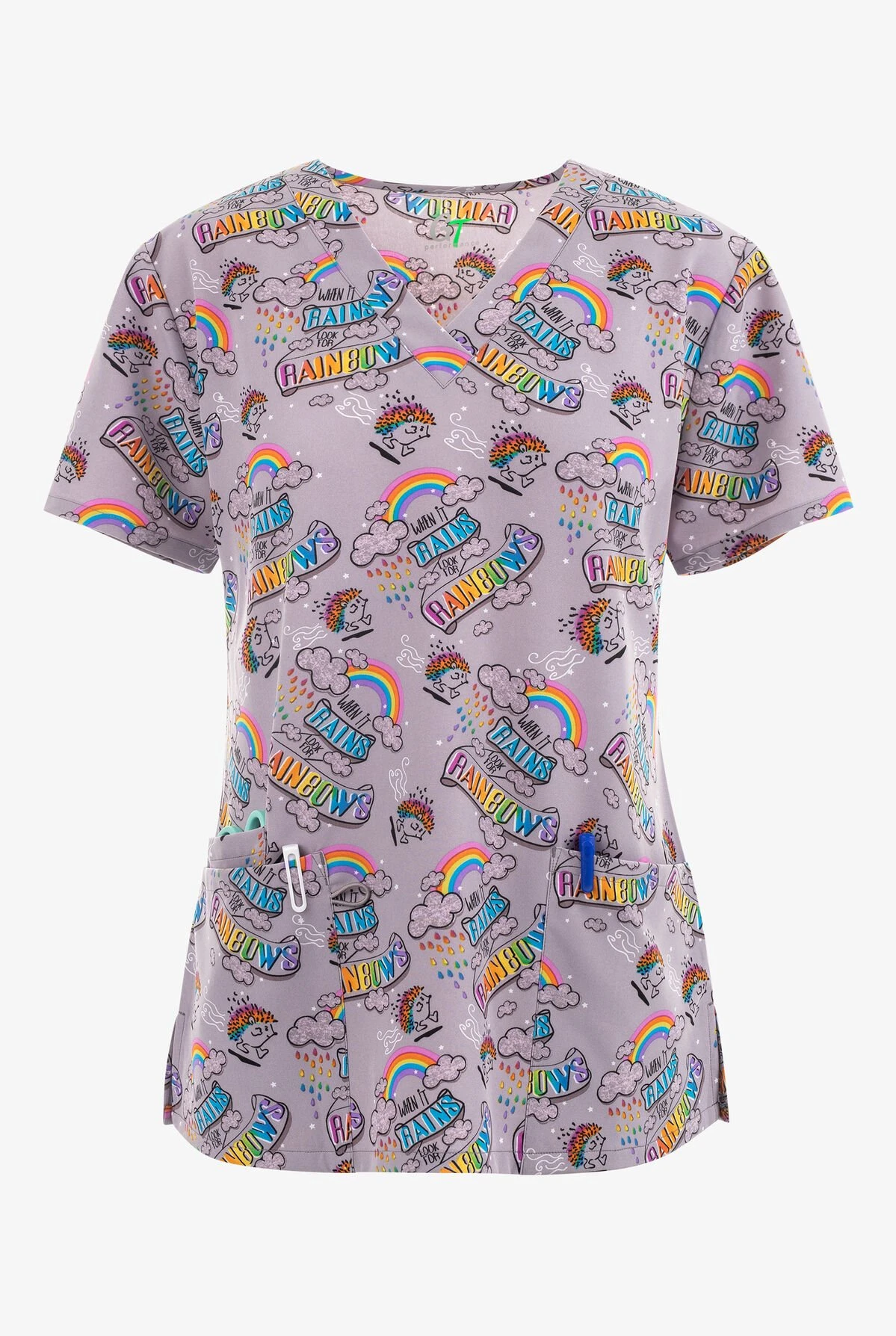 Green Town Whimsical Look For The Rainbow Women’s 3-Pocket STRETCH V-Neck Print Scrub Top
