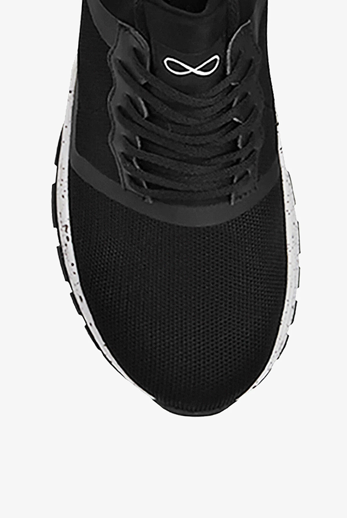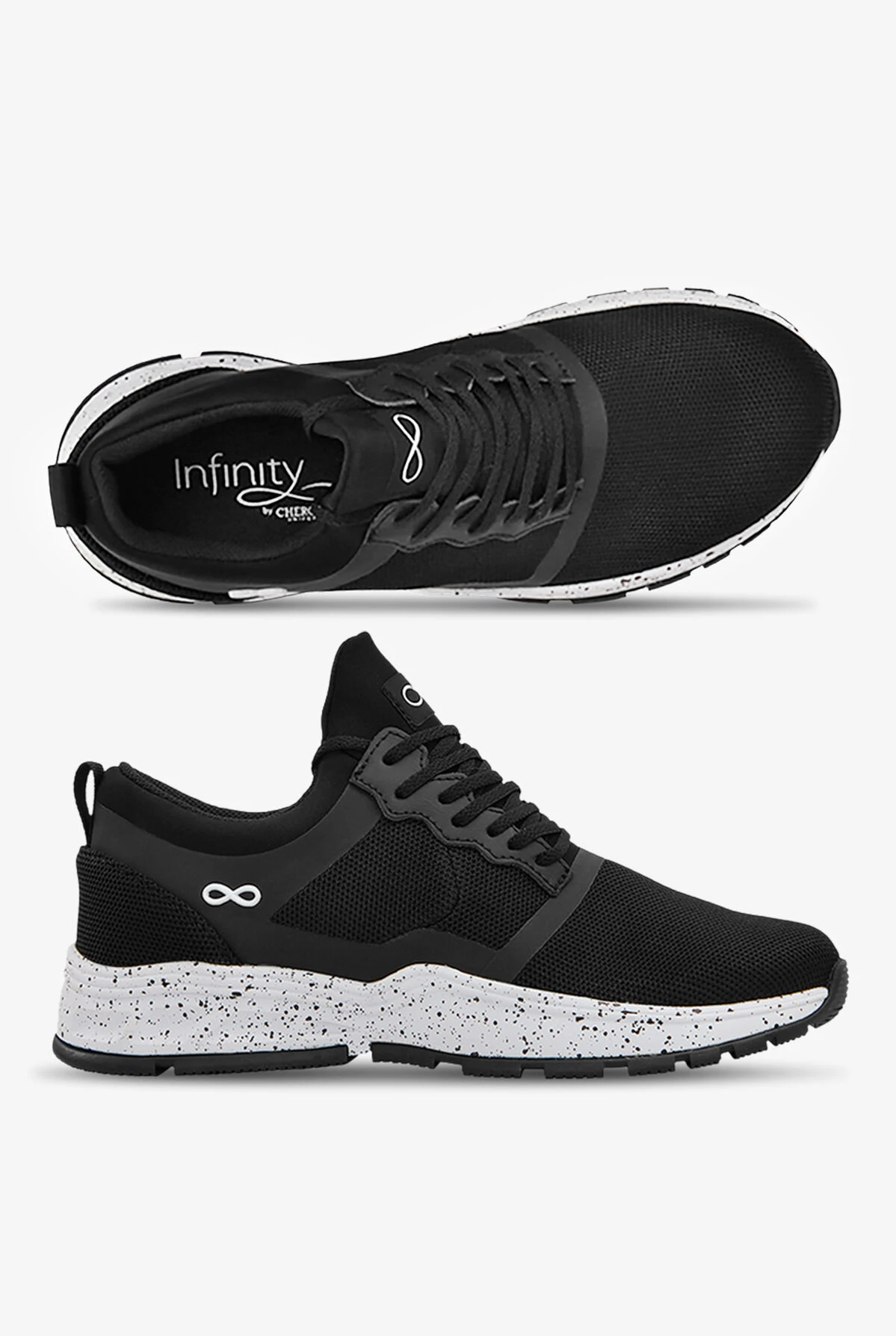 Infinity by Cherokee Fly Black Flecked Athletic Lace Up Shoes feature breathable mesh uppers with adjustable laces. A removable, multi-layered insole and EVA midsole cushion and support. Slip- and oil-resistant outsole has strategically-placed flex grooves. In classic black with a cool flecked midsole.