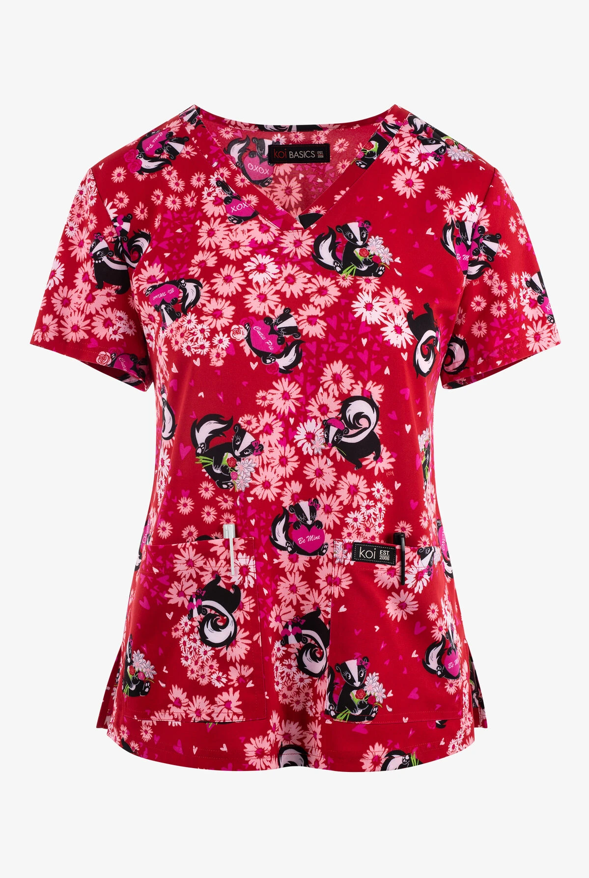 - Adorable skunks holding bouquets of flowers and hearts on a ruby background