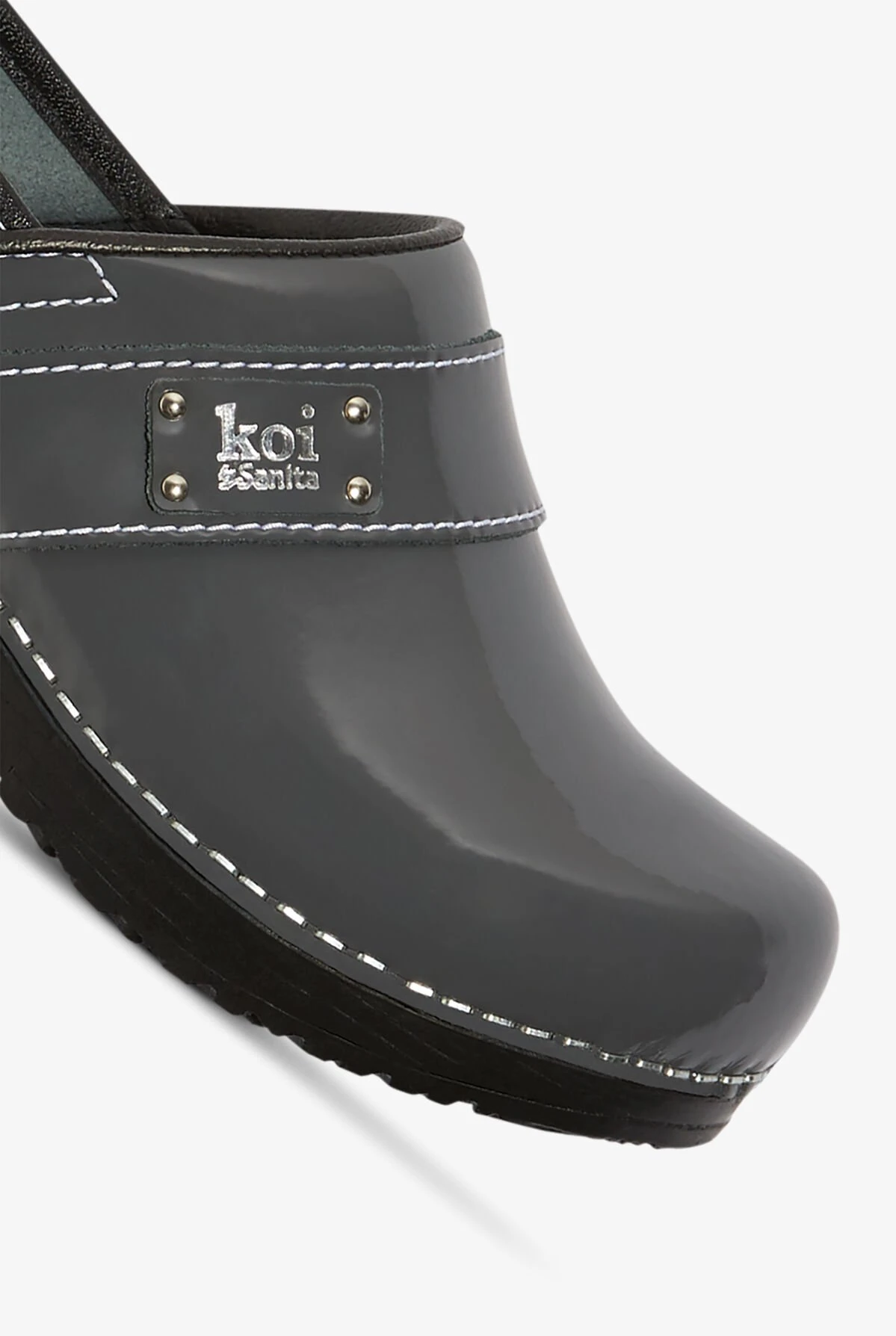 koi by Sanita Professional Lindsey Clogs are approved by the American Podiatric Medical Association (APMA) – ensuring your comfort. Inside, there’s a cushioned microfiber insole and anatomically correct footbed. The shock-absorbing outsole features a rocker bottom. And it’s hard to go wrong with a steely gray patent leather. Timeless.