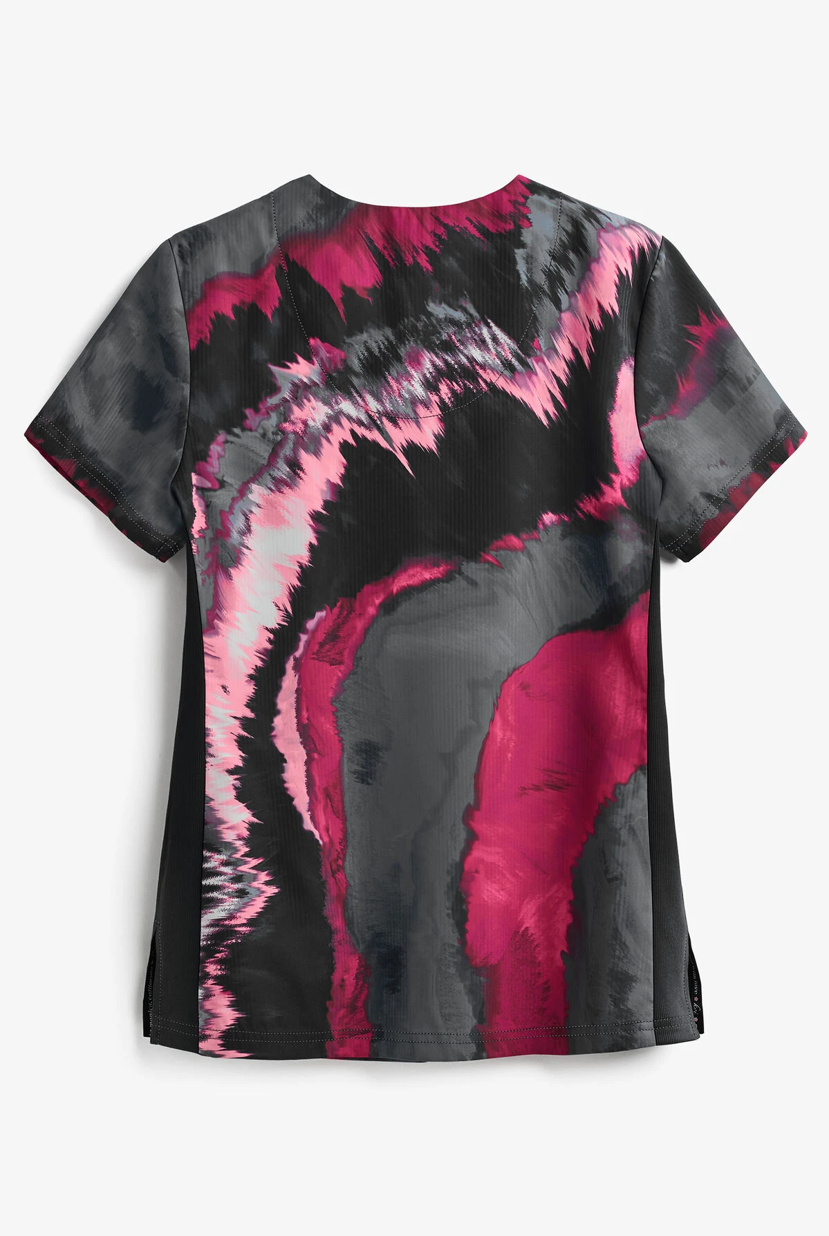 The UA Exclusive koi lite1045PR-GFO Reform Ombre V Neck Print Scrub Top Pink Marble Placement features a classic V-neck with a fashion-forward Ombre print. Top has front shoulder yokes with bungee id loop on right side, two in seam side entry pockets, contrast double needle stitching on v neck, yoke, sleeves and hem. Side vents and rib knit side panels for shaping. Fabric content is breathable, moisture-wicking 100% polyester dobby and 95/5 poly/spandex panels.