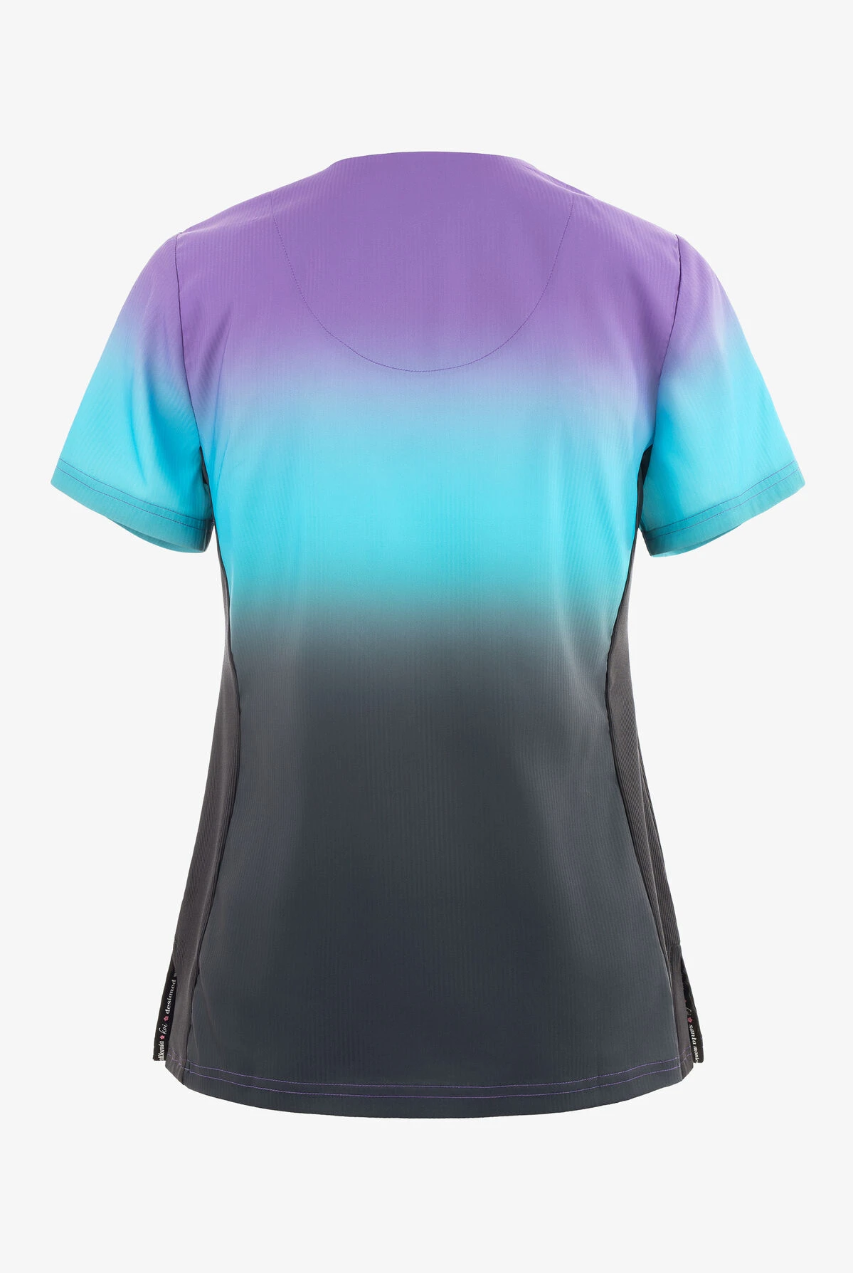 koi Lite Wisteria/Electric Blue/Charcoal Ombre Women’s 2-Pocket STRETCH V-Neck Print Scrub Top
