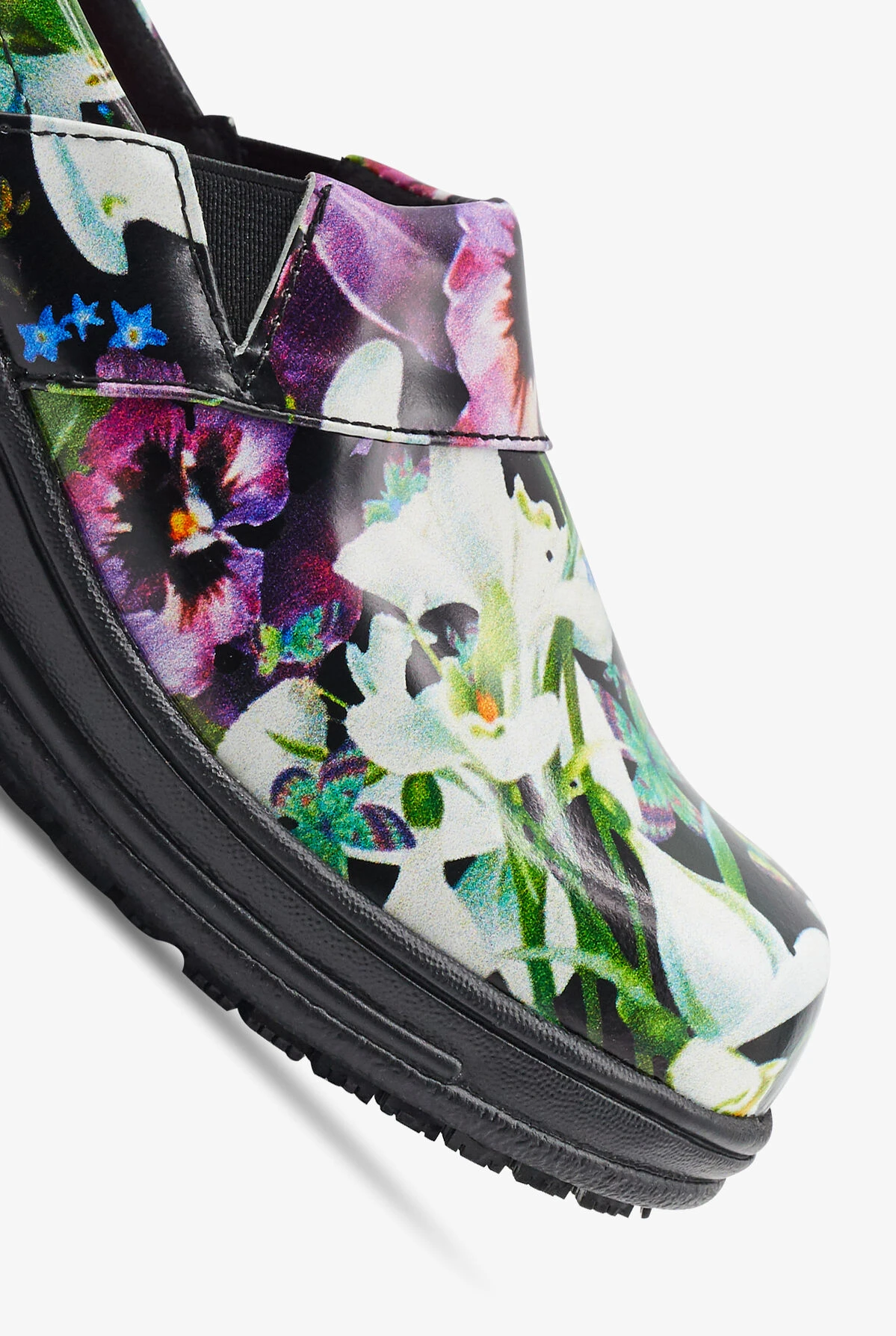 The Laforst 7003-302 Rachel Purple Flower Women’s Nursing Shoes feature a patent leather upper, double side goring, and a padded instep collar. These shoes come with a memory foam insole and a lightweight flexible rubber outsole. There is a compression molded EVA midsole and a slip-resistant outsole. Heel height is 2″.