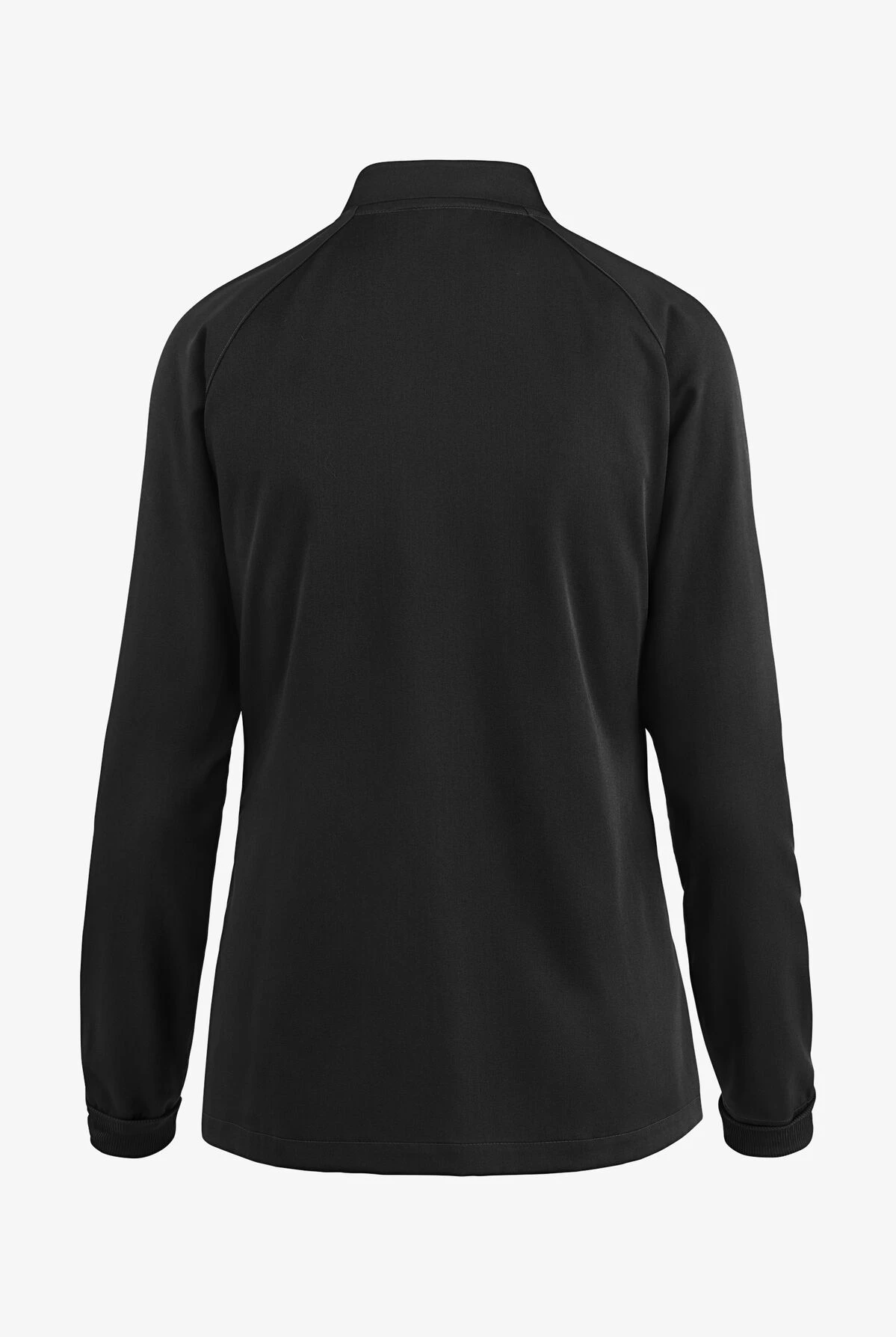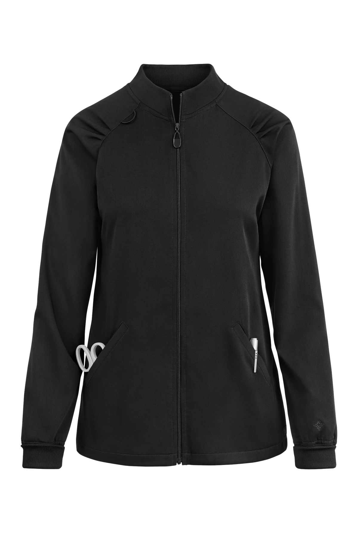 The Med Couture Touch Women’s 4 pocket Raglan Warm Up Scrub Jacket features a classic fit, stand up collar, full front zipper closure, raglan sleeves with rib knit cuffs, bungee ID loop on right shoulder, and 4 pocket 2 front angled welt pockets and 2 in seam side pockets. Fabric content is 76/21/3 poly/rayon/spandex, rib knit is 92/8 poly/spandex.