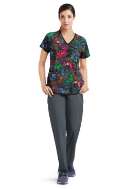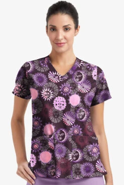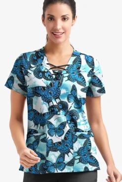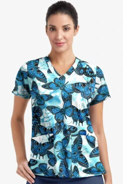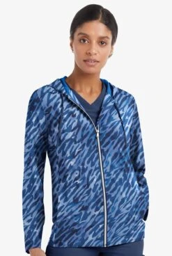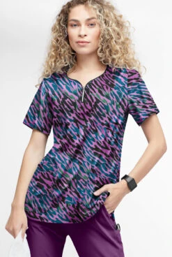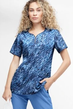 Easy STRETCH By Butter-Soft Abstract Animal Caribbean Blue Women’s 4-Pocket Zip Neck Print Scrub Top