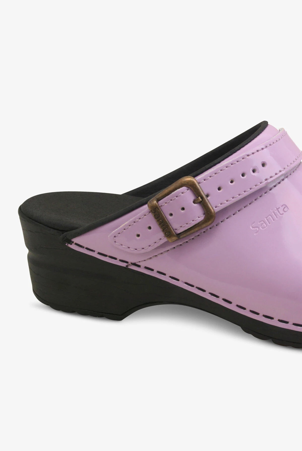 Sanita Professional Estelle Lilac Backless Patent Leather Clog are approved by the American Podiatric Medical Association (APMA) – ensuring your comfort. Inside, there’s a breathable microfiber insole and anatomically correct footbed. The shock-absorbing outsole features a rocker bottom.