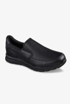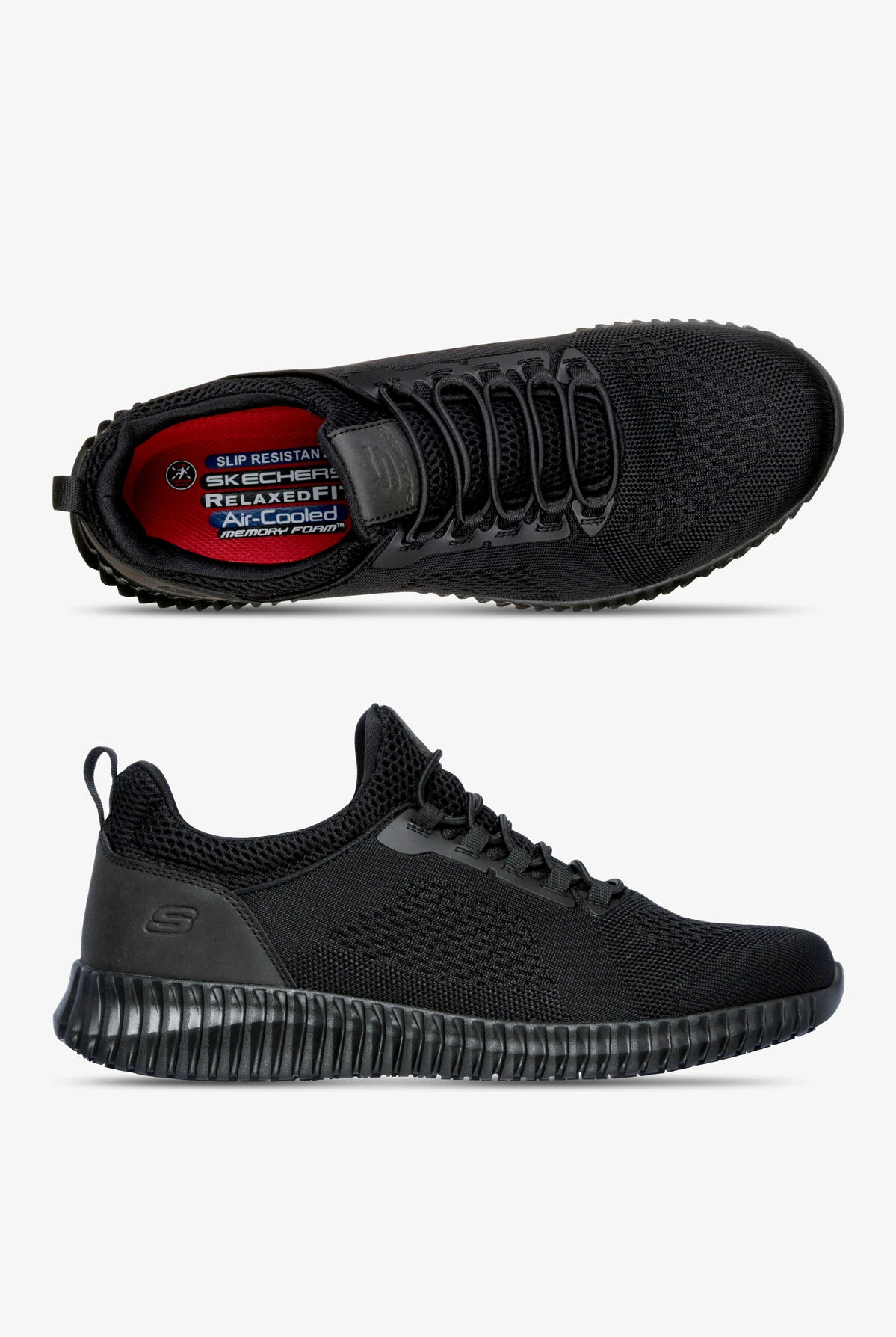 The Skechers 77188 BLK Work Cessnock Men’s Athletic Shoes feature a water and stain resistant woven knit mesh upper, slip on design with bungee laced front panel, a padded collar, and soft fabric shoe lining. These nursing sneakers include a relaxed fit design with memory foam cushioned comfort insole for a roomy, comfortable fit. The flexible, athletic-inspired midsole is lightweight and shock absorbing. For extra security, there is a slip resistant rubber traction outsole. Heel height 1 1/4″.