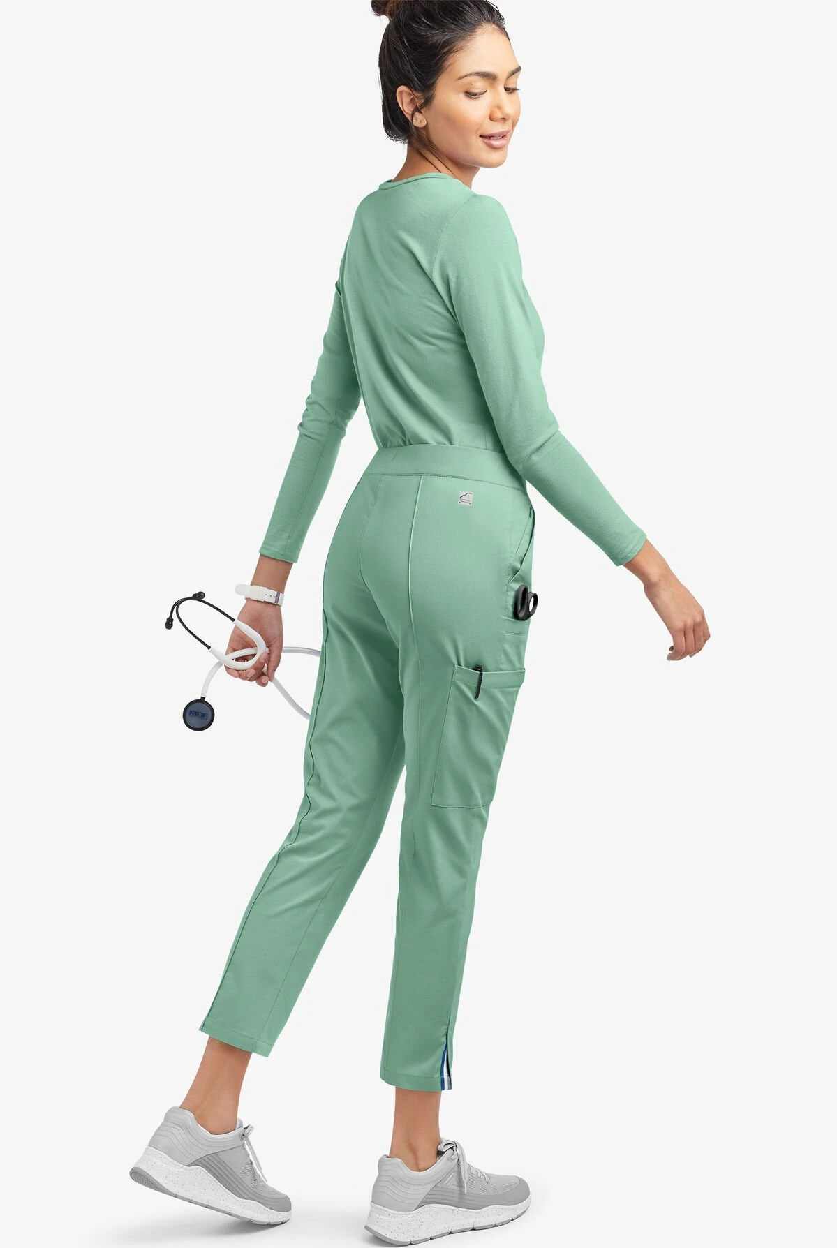These UA Butter-soft Stretch women’s 6 pockets pin-tuck crop slim with sport trim detail scrub pant feature a modern fit, mid rise with cropped slim leg. This pant has elasticated waist with inside contrast knit trim for comfort and adjustable sport striped drawcord for security. It has 6 pockets total; 2 angled front pockets, 1 small items zipper pocket, 2 welt pockets and 1 roomy cargo patch pocket. It also has side vents with contrast sport stripe trim and pin-tuck detail for a fashionable tailored look. Made of 55/42/3 cotton/poly/spandex.