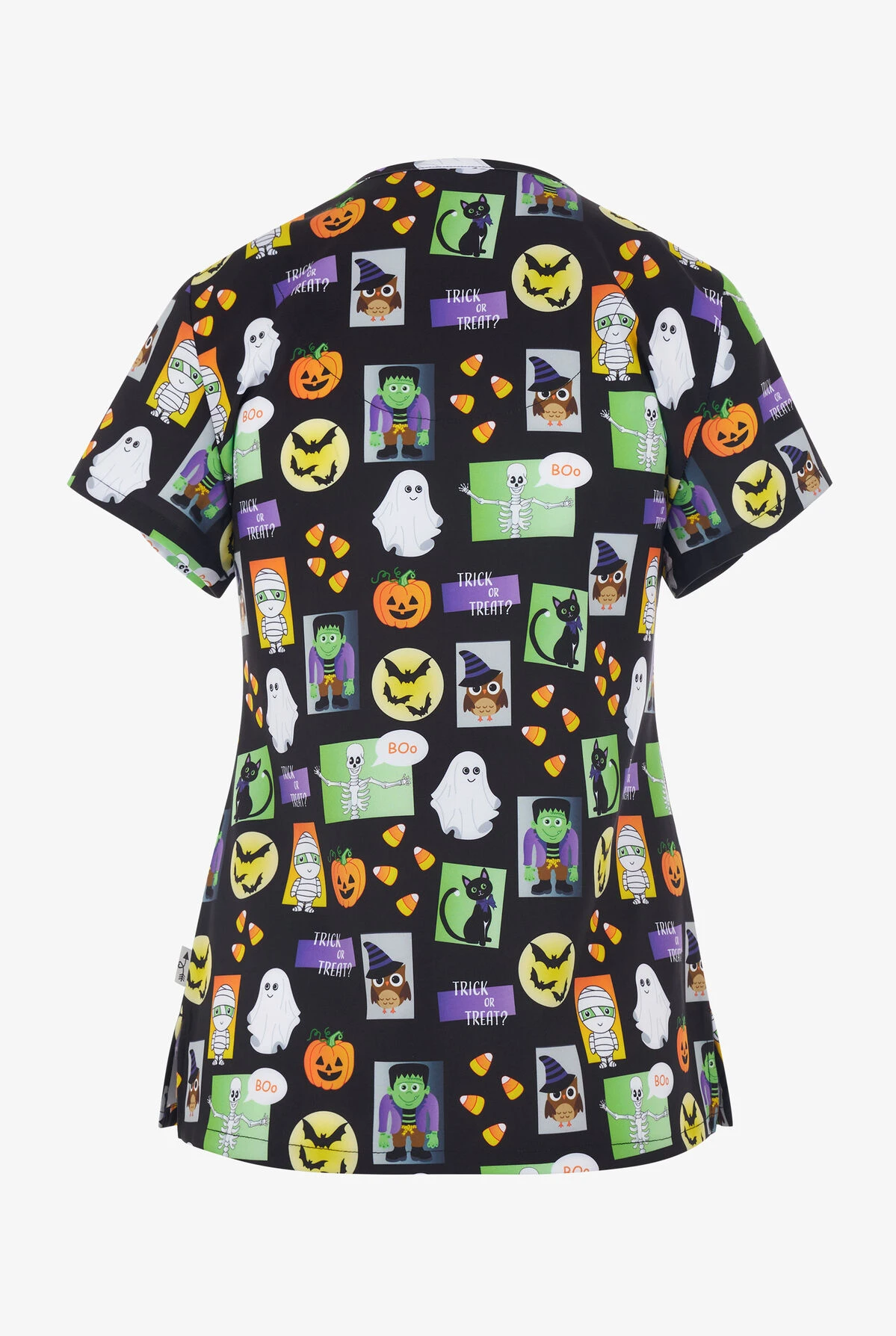 Zavate Ava Therese Feeling Fa-boo-lous Halloween Women’s 2-Pocket STRETCH V-Neck Print Scrub Top
