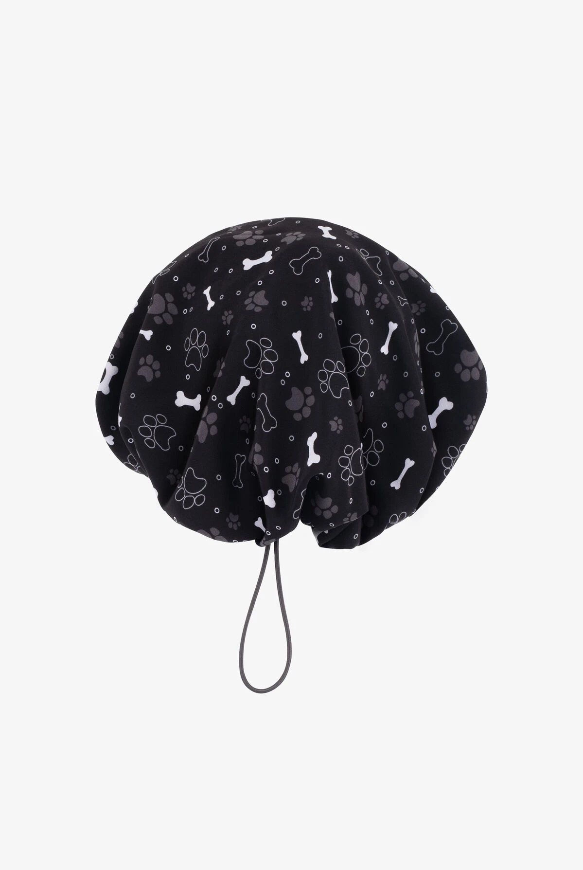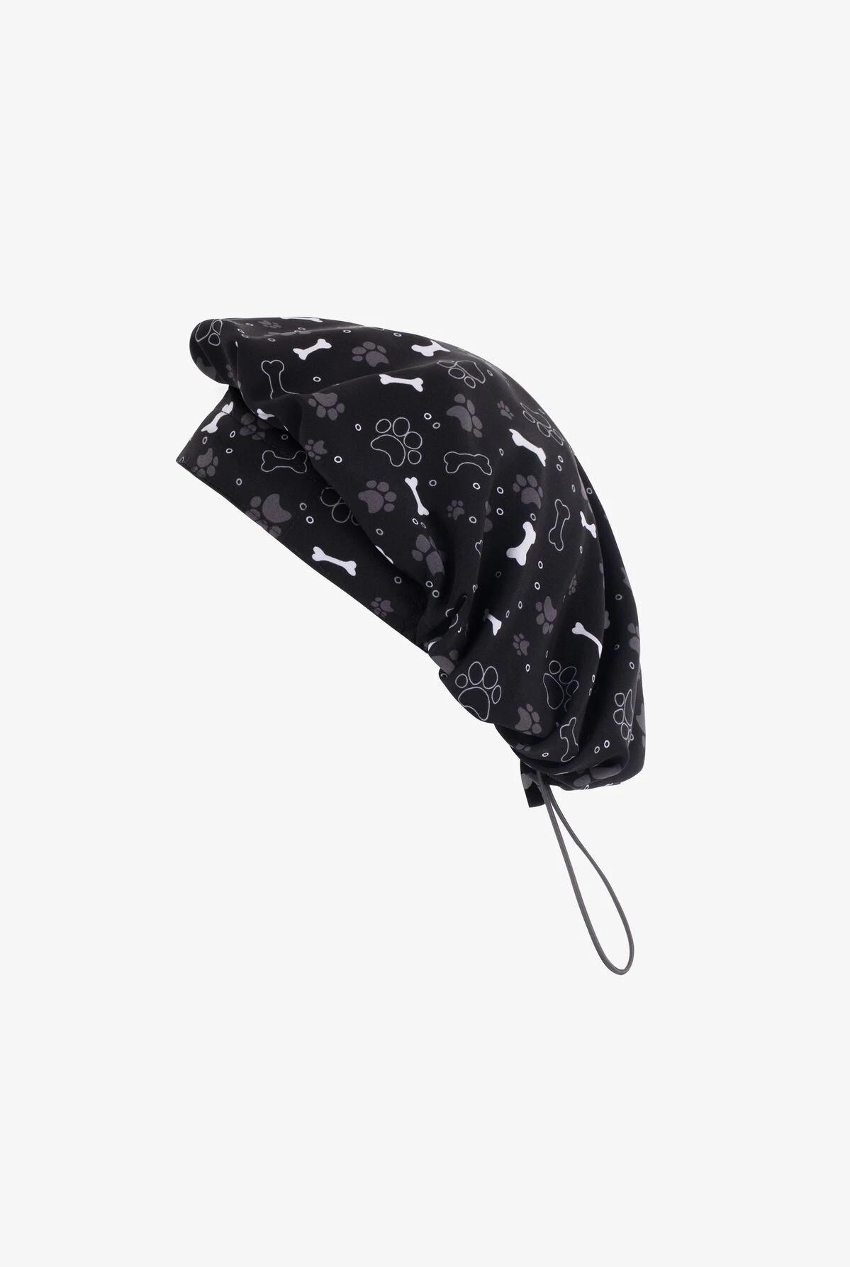 - Bones and paws on a black background makes for a perfect veterinary scrub hat